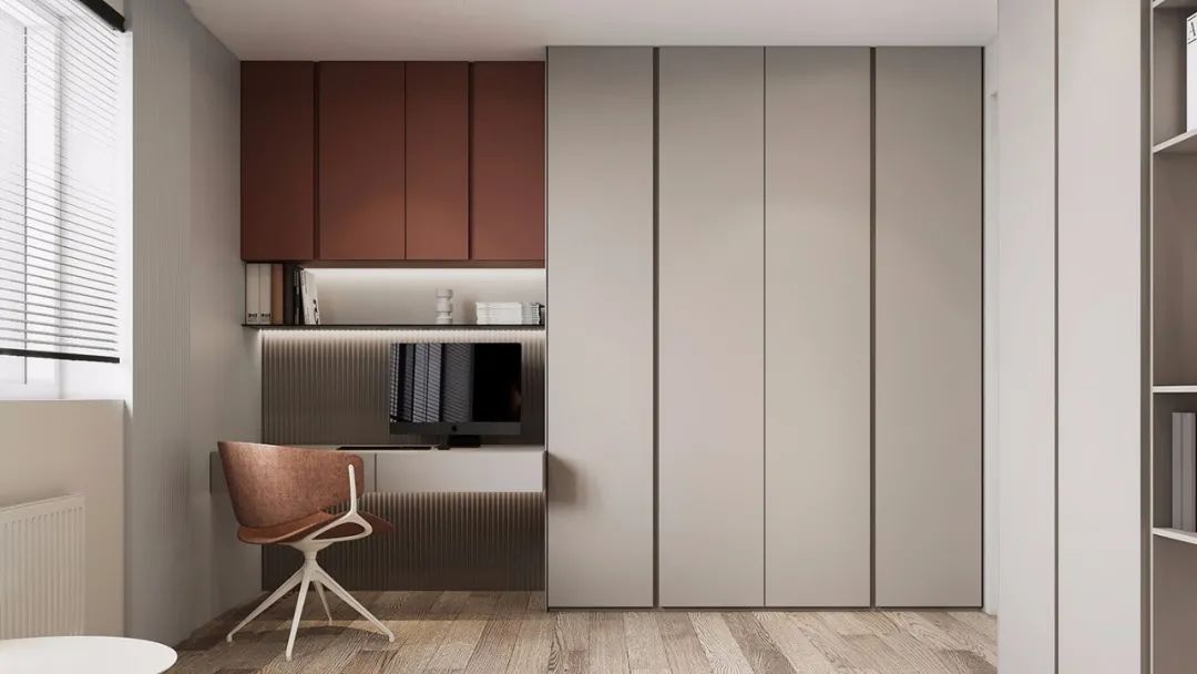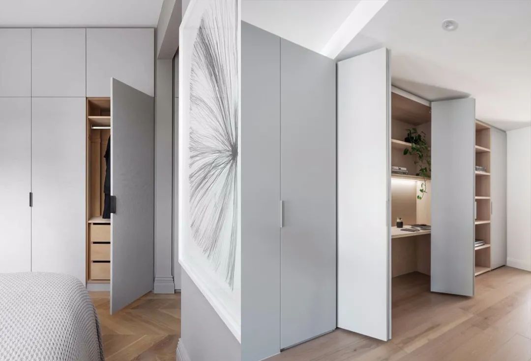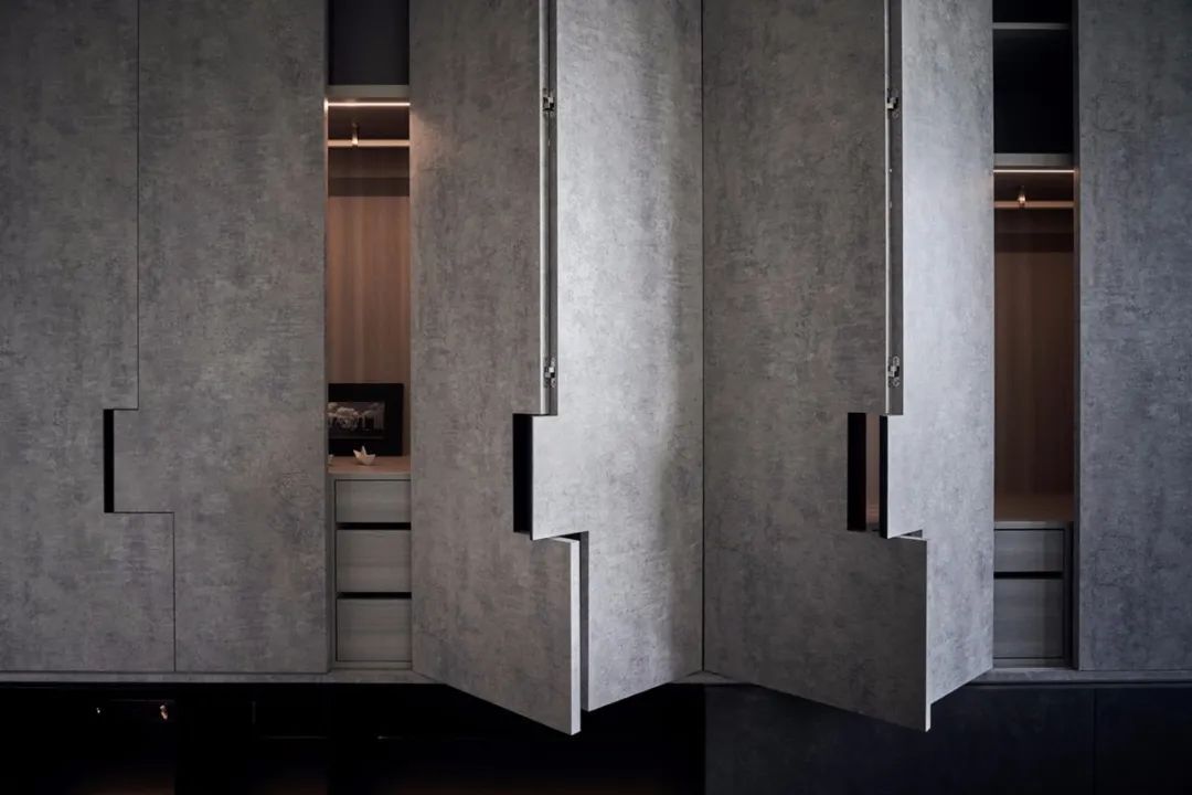 垂拔挺立的超高柜門,除去了把手的多余突兀感,讓整個柜門看上去并不會單調乏味,上下連貫垂拔,左右連續的超高柜門形成的多層次塊面讓空間的整體性更強。