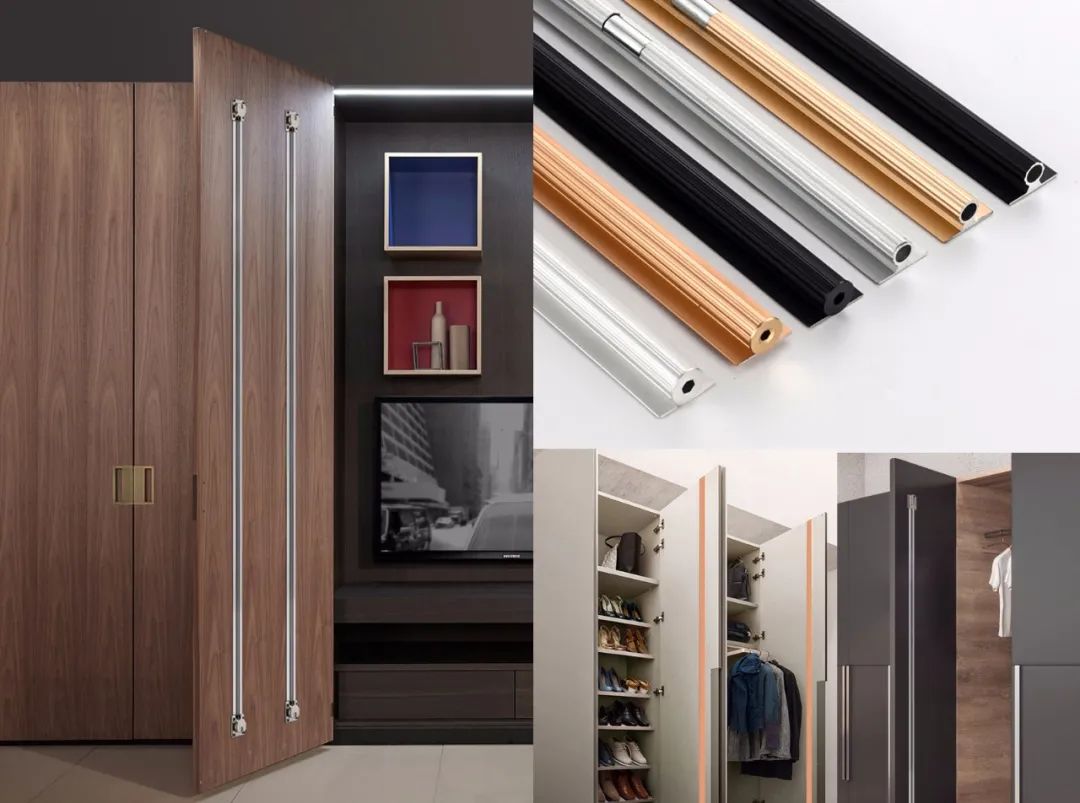 傳統的衣柜柜門板封邊都是使用的PVC的封邊材料,如果超高柜門依然采用PVC封邊條材料,完全扛不住柜門變形的風險,但經過改良采用鈦合金或者鋁合金的材料來替代原本的PVC材料封邊,拉手做成通頂式,并且用鋁合金或鈦合金包覆,一般會在拉手之間的縫隙預留出45°左右的斜角或者預留圓弧兩種拉手的形式方便打開柜門,這樣一來,既完成了封邊,也防止變形。