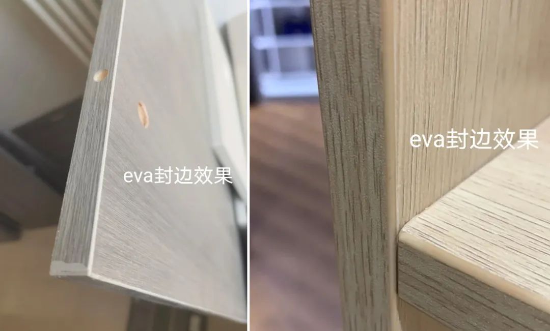 EVA封邊所用膠水比較多,環保性能比較差,耐用性也比較差,尤其是淺色的板材,表面會產生明顯的膠線,影響美觀效果和平整度。