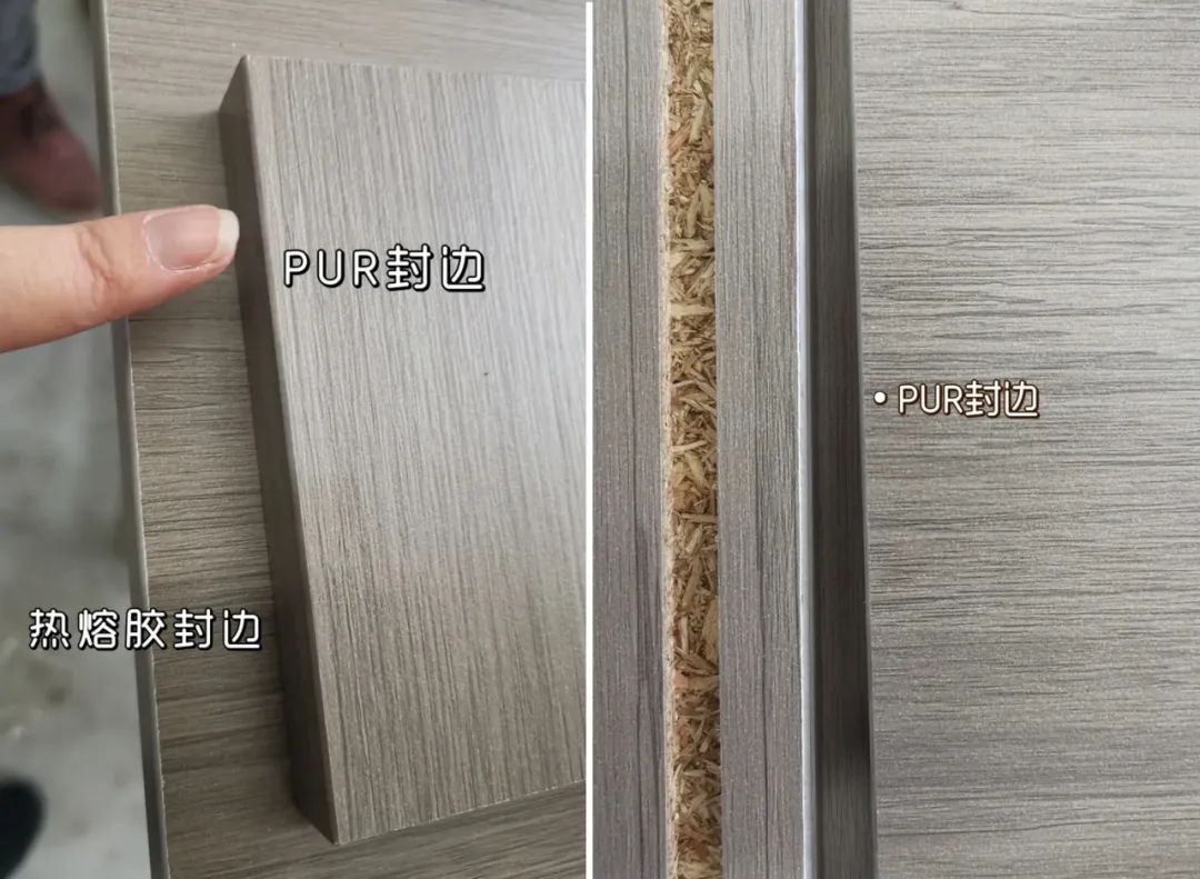 耐用性方面、環保性能方面、封邊粘接牢固性能方面都要比EVA封邊強很多。另一方面,PUR封邊無論是淺色板材還是深色板材,都不會產生明顯的膠線,美觀度遠遠超過EVA封邊工藝。價格方面這種封邊方式成本高昂,還有就是用這種封邊工藝的工廠,在國內也是少之又少。